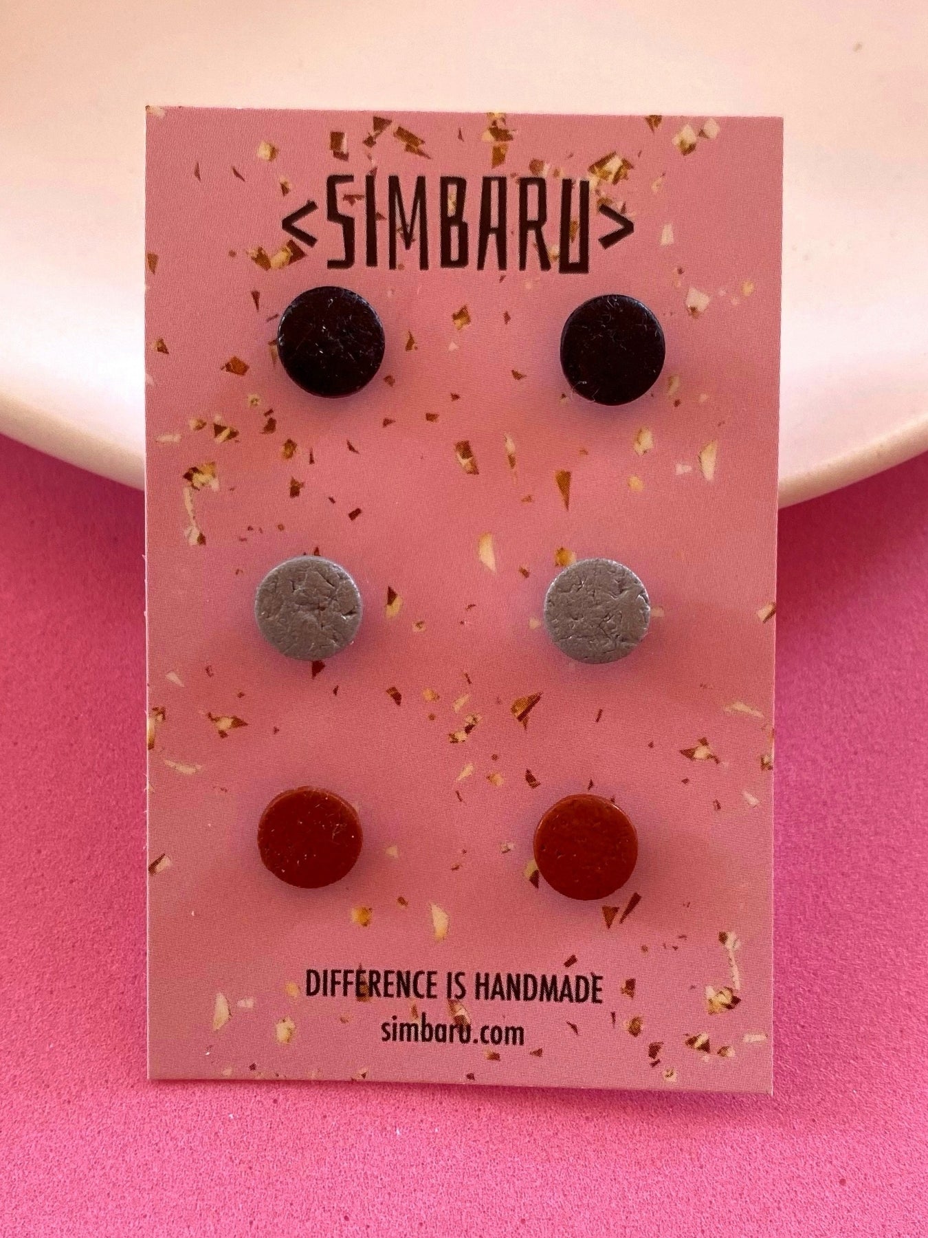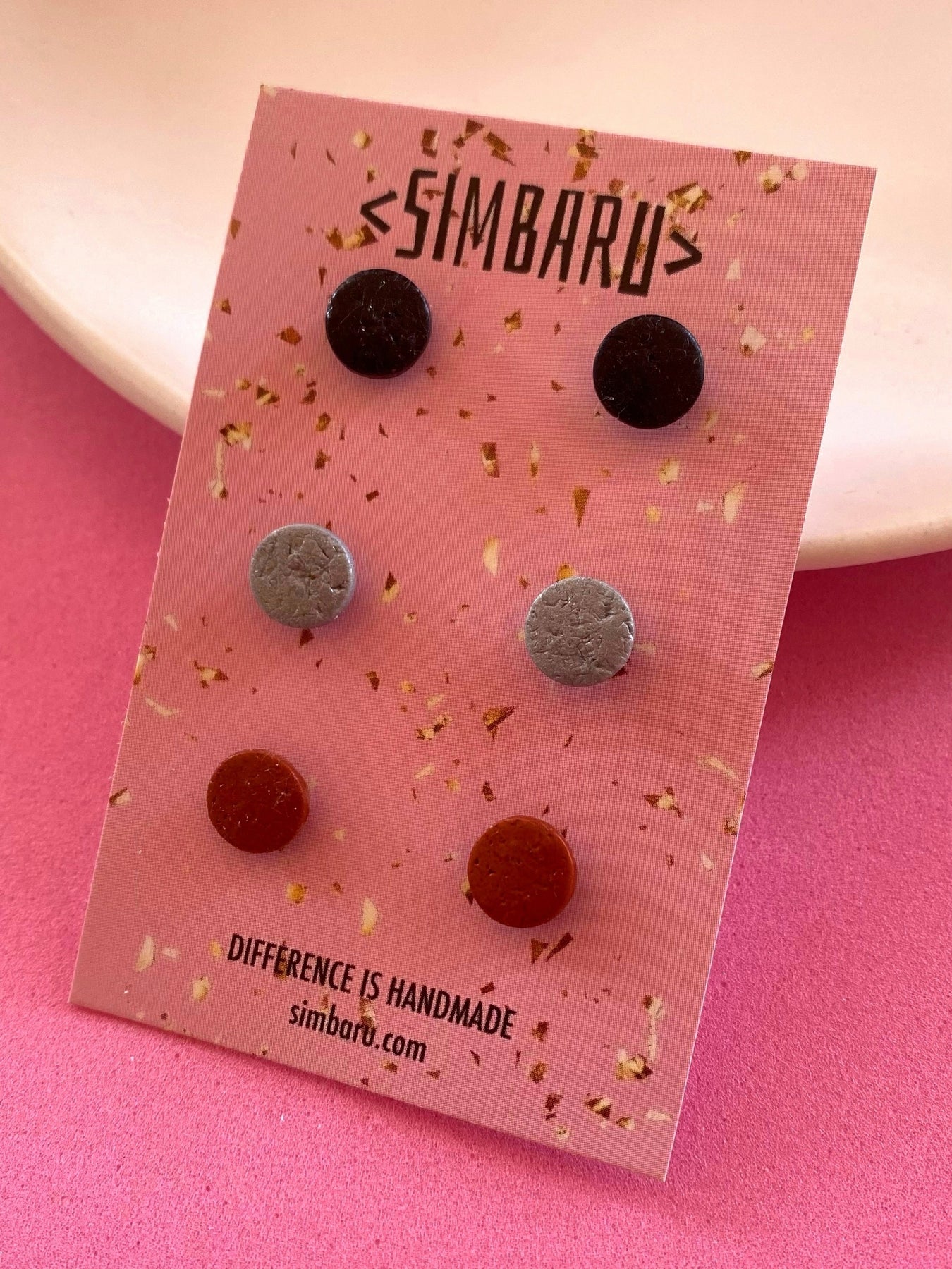 Pack de 3 pares de mini Pendientes de botón, en negro, plata y cobre con diseño circular, hechos a mano de arcilla polimérica en un proceso totalmente artesanal.